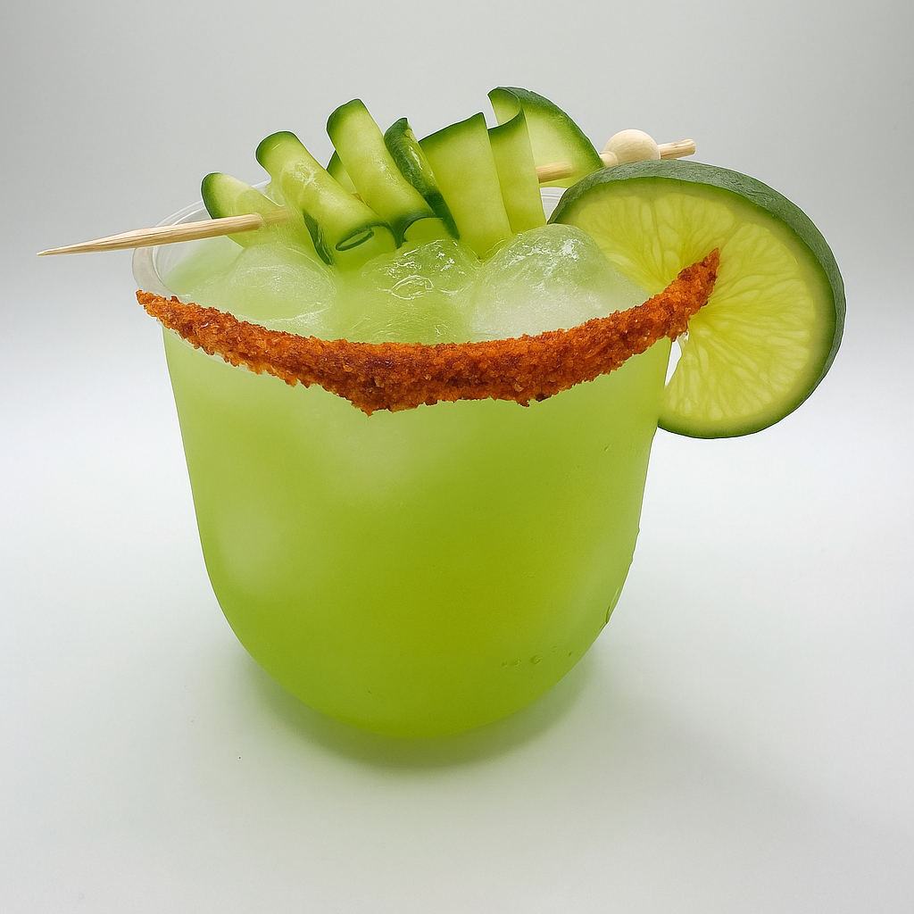 Tequila, fresh lime juice, orange liqueur, rich simple syrup, fresh cucumber juice and tajin rim.