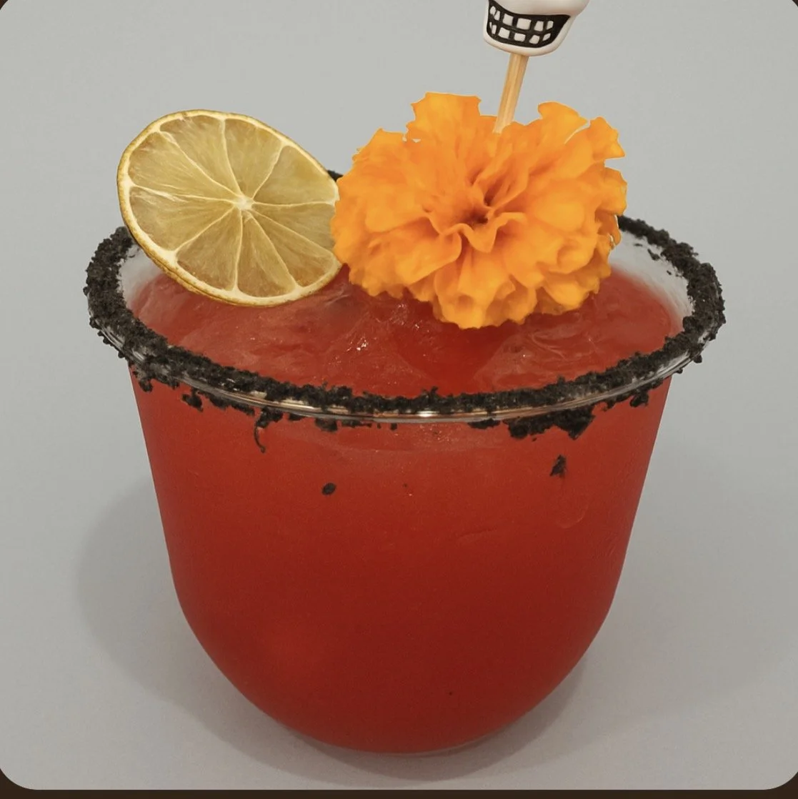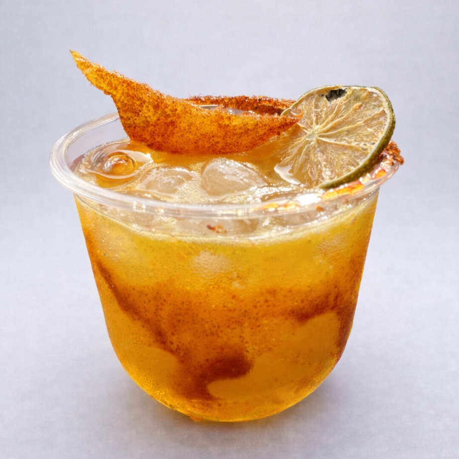 Tequila, mango nectar, lime juice served in a chamoy marbled cup