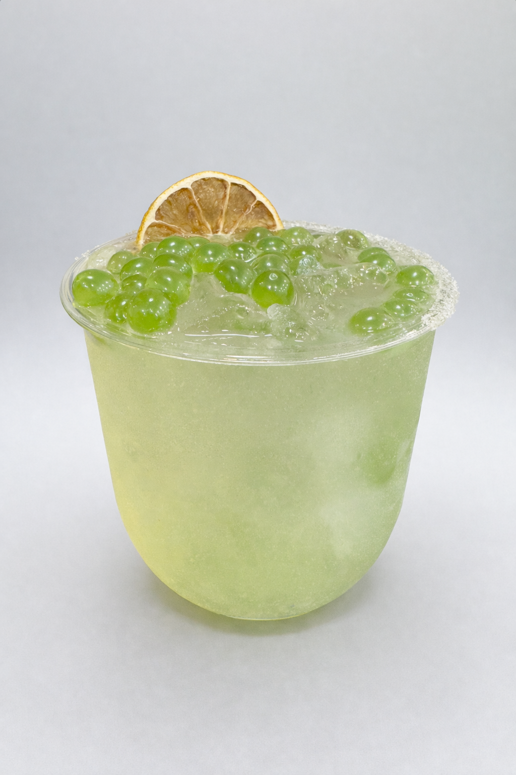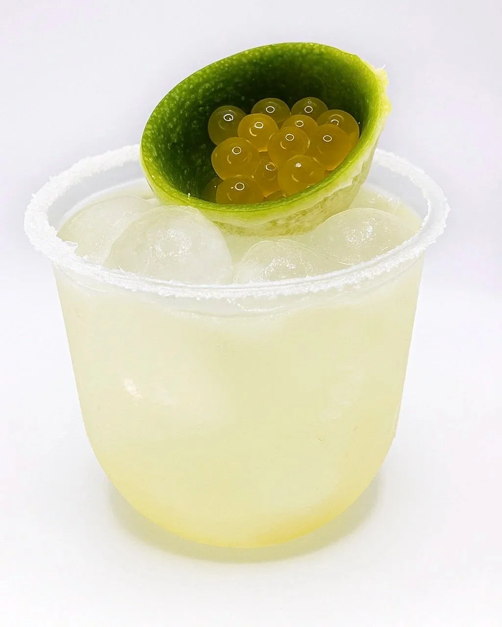Classic lime marg with mango boba pearls in a lime boat